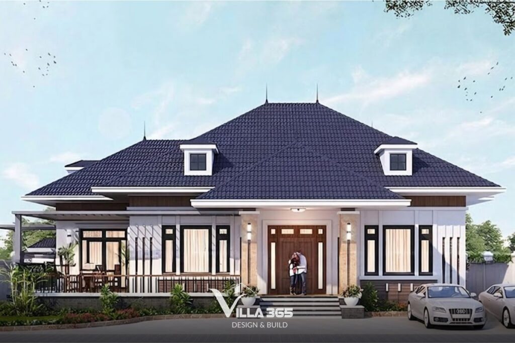 Mái Thái bốn dốc là lựa chọn phổ biến nhất cho mẫu biệt thự 1 tầng tân cổ điển tại Việt Nam. Độ dốc lớn giúp thoát nước nhanh trong mùa mưa, tạo lớp đệm không khí cách nhiệt tự nhiên và cho phép công trình nhìn cao hơn, thoáng hơn.