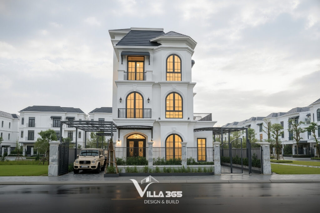 Tổng thể mẫu biệt thự được xử lý hình khối cân đối, chắc chắn với ba tầng được phân chia rõ ràng nhưng vẫn liên kết mạch lạc. Yếu tố vòm cong lặp lại đều đặn từ tầng trệt đến tầng trên, thiết lập nhịp điệu kiến trúc ổn định và tạo chiều sâu cho mặt đứng công trình.