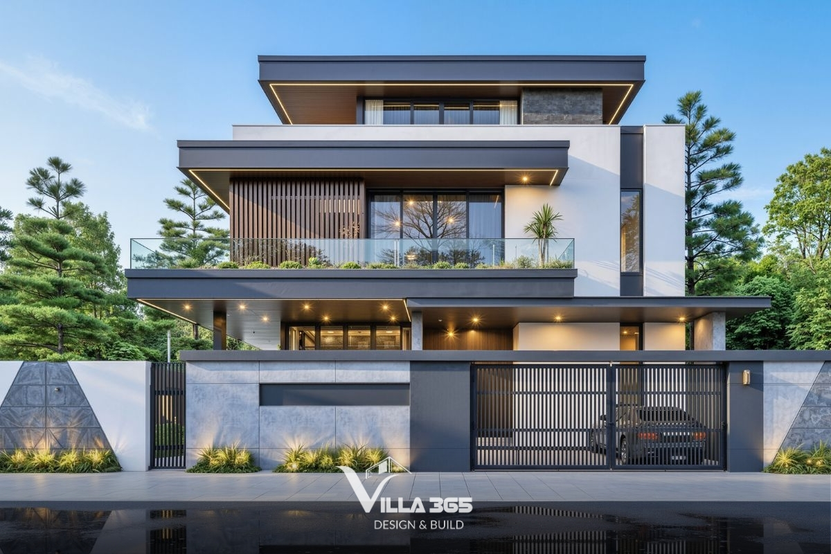 Biệt thự hiện đại gồm 3 tầng với các khối vuông vức được sắp xếp theo dạng giật cấp. Tầng 2 và tầng 3 có các khoảng lùi so với tầng trệt, tạo chiều sâu và không gian cho ban công. Mái bằng với phần máng nước dày, mang lại cảm giác kiên cố và hiện đại.