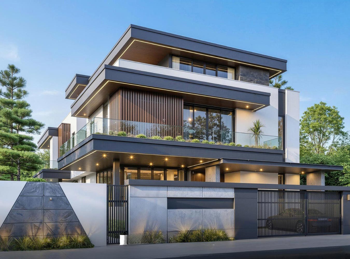 Thiết kế biệt thự hiện đại tập trung vào hình khối gọn gàng, đường nét rõ ràng và tổ chức không gian linh hoạt, ưu tiên công năng sử dụng cùng khả năng đón sáng, thông gió tự nhiên. Phong cách này đặc trưng bởi mặt tiền tối giản, vật liệu hiện đại như kính, bê tông, kim loại và bảng màu trung tính trắng – xám – đen.